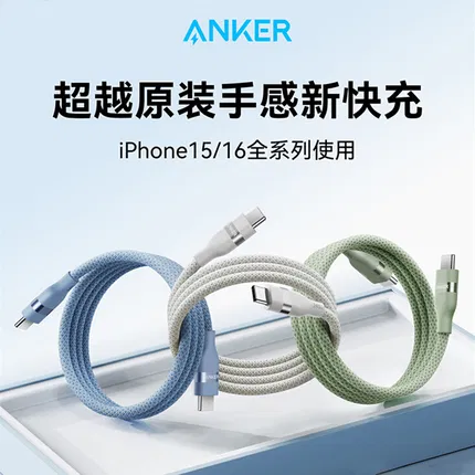 ANKER安克 亲肤编织快充数据线 Type-C to Type-C 0.9m 240W 多色选